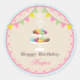A birthday sticker featuring a tea party theme. Illustration of two tiered stand of French macarons at center. Background is blue gingham pattern and beige lace with pink accents. Gingham and solid bunting at top. Personalize the text.
