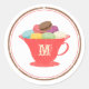 A sticker featuring a vintage inspired illustration of colorful French Macarons in a delicate red teacup. Illustration is surrounded by decorative brown and red circles. Personalize with the letter of your initial.