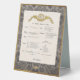 in tones of taupe, black and cream with the appearance of gilded accents our table tent sign design contains authentic items of fine cuisine from a real French Menu. Makes a decoratively 'tasteful' French accent to place on your dining room sideboard, or display this French menu on the tabletop, to create a cozy table-for-two look from a chic French bistro. Just add candlelight! This sign is equally at home in an elegant Paris-style-décor studio apartment or a casual French Farmhouse decorating scheme – but it's sleek design would suit a contemporary dining setting, as well. Find this French Menu print also on our durable pedestal sign option for the tabletop. There's also an easy-care magnetic card version to use as refrigerator art. This design is additionally available as an 8" x 10" frameable card stock print to hang in your kitchen or on the wall of your dining space.