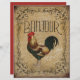 Vintage rooster with text Bonjour and Paris. Surrounded by lace border and script ephemera background.