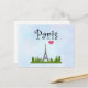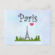 A postcard with a whimsical drawing of the Eiffel Tower in the background surrounded by green trees. A pink heart and Paris typography add a girlish flair.