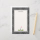 Stationery paper designed with a black and white polka dot background and a whimsical drawing of the Eiffel Tower surrounded by green trees and pink watercolor heart floating in the air.