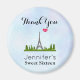 A sweet sixteen commemorative thank you magnet with a whimsical drawing of the Eiffel Tower in the background surrounded by green trees. The background is a digital image of blue watercolors.