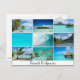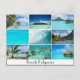 Postcard with a collage of multiple images of the beaches of the islands of French Polynesia, like Tahiti, Moorea, Bora Bora and Rangiroa with a white bar with the text: 'French Polynesia'.
