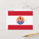 The flag of French Polynesia was adopted in 1984. Two red horizontal bands encase a wide white band; centered on the white band is a disk with a blue and white wave pattern depicting the sea on the lower half and a gold and white ray pattern depicting the sun on the upper half; a Polynesian canoe rides on the wave pattern; the canoe has a crew of five represented by five stars that symbolize the five island groups; red and white are traditional Polynesian colors.