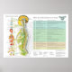 French Chiropractic Subluxation Spinal Nerves ANS. Effets des Subluxations sur le Corps. Colorful anatomical image showing the autonomic nervous system in relation to the spine and the internal organs. Nerves representing the sympathetic, parasympathetic and cerebralspinal system. Chiropractic poster list the effects of spinal subluxation on body areas and possible symptoms associated. Color coded by spinal level.