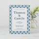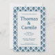 Plain white envelopes are included with paper invitations and will come to fit the invitation size you select. If you don’t need the envelopes, you may choose to not receive them by selecting the dropdown below "Envelopes" and choosing "None." If you’d like to have a design on your envelopes, you can browse all of these available envelopes to find the design that complements your French Tapestry Blue And White Wedding Invitation.