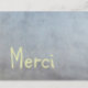 Thank you card says Merci, French for Thank You, in playful yellow letters on an understated gray background.