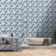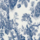 Beautiful blue and white French Toile style wallpaper features peacocks on branches.