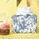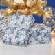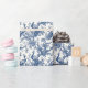 Pretty blue and white French Toile style wrapping paper features peacocks on branches, adding a touch of vintage elegance to any gift.
