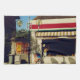 The flavor of France is captured in the original photograph by ZoeSPEAK on this Kitchen Towel. Taken in the town of Hourtin, in the wine country of the Medoc, the photo shows the village bakery in the afternoon sun. The shadow of an old fashioned street lamp stretches across the sidewalk onto the wall below the display window. Over the window is a striped awning with the words "PATISSERIE" AND "PAIN" ("pastry" and "bread"), and a bold red stripe across the cream colored building. An old circus poster and a placard for ice cream bars add color to the scene. Leafy green vines climb over the stone wall on the side of the shop, throwing their shadows across the walls. Part of a taller building in shadow, a walkway and blue sky complete the picture. The photo was taken in 2002.