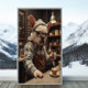This hilarious poster features a French Bulldog in full human barista form, rocking a beanie, suspenders, green and white flannel shirt, and thick-rimmed glasses. He’s behind the coffee bar, laser-focused as he pours perfect latte art—milk frother in one paw, espresso cup in the other. His wide-eyed expression shows just a bit too much caffeine. The chalkboard behind him lists drinks like “Bark Roast” and “Fur-rotto.” It’s a must-have print for coffee lovers and dog fans alike.