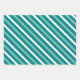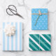 A fresh and fun trio of wrapping paper sheets in various shades of blue and teal with white stripes and polka dots. This stylish combination is perfect for wrapping birthday and/or holiday gifts for your friends and family. The blue and teal colors work for young and old alike.