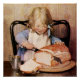 Jessie Willcox Smith was an American artist known for her idyllic imagery of childhood. She was the cover illustrator for the magazine Good Housekeeping for 15 years.A young girl with blonde hair is sitting at a table, cutting into a large loaf of bread. She is wearing a blue dress and a white apron, with a metal cup beside her. This painting is called “Fresh Bread”.