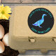 Colorful stand out fresh free range eggs product label with business details. Easy to personalize handwriting modern typography in teal using the template. Modern colorful duck illustration in bright colors, unique original artwork by artist Catherine Sweetman