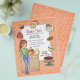 Delightful bake sale flyer theme. Perfect for a patisserie, bakery and other sweet treat businesses too. This design features a young lady stirring a bowl of batter. Blue and white banner has cakes, cookies and cupcakes on it's border. Peach and white hearts background on front and back. All text on this flyer is ready for you to customize in any way you wish. The standard 80lb matte finish is recommended as the better choice if you plan to fold these flyers as the 100lb is a bit stiff for folding...similar to card stock.
