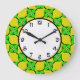 A fresh and bright pattern with brilliant yellow lemon shapes interspersed with lime green flower shapes that have bright orange centers and a white clock face with big easy to read numbers.