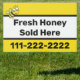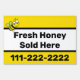 This yard sign has a bee at the top. In the center, there's black display text you can edit if desired. (Shown: Fresh Honey Sold Here) At the bottom, you can replace the display phone number with your telephone number.