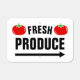 Fresh produce farm metal sign with direction arrow pointing right or left. Attach to outdoor fence, pole, gate, wall etc. Custom signage for farmer's market, shop, grocery store, food producer, business, company etc. Custom road sign for marketing your products. Help traffic, guest, visitors, friends, family find their way to your products. Red tomato logo with bold text template.
