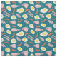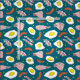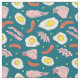 Dark blue fabric with a fun food pattern of fried breakfast eggs, bacon and sausages