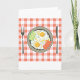 A favourite of most people is fried eggs. This design is some very tasty looking fried eggs on a place. Next to the plate is a knife and fork and the plate is sitting on a checkered table cloth. These fried eggs look particularly good. This fried eggs on a plate design looks great on these greeting cards