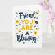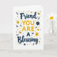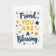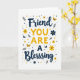 This greeting card features the phrase “Friend YOU ARE A Blessing” centered on a bright white background, arranged to feel like a warm note between close companions ❤️. “Friend” sits toward the upper left of the main text cluster in deep navy, with “Blessing” placed larger near the lower right in the same flowing lettering, as if the words are gently reaching toward each other. Between them, “YOU ARE A” appears in uppercase golden-yellow, set in a simple, modern style that stands out clearly. Small golden hearts float around the wording, adding a soft, affectionate sparkle without crowding the space 🌼. Simple flower shapes in navy and yellow dot the area like little tokens of care exchanged back and forth. Thin dark sprigs and a few winged insects in matching tones drift near the edges, guiding your eye around the message. Tiny round accents are sprinkled across the design, and the navy-and-gold details sit lightly against the white field.