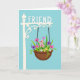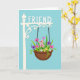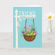 This card features a sky-blue background with a sturdy cream-colored pole on the left, decorated with curled metal details that feel a bit like an old street sign. From the pole’s arm, a woven brown basket hangs on two thin black chains, swaying as if it was placed there for a close friend to notice ❤️. The basket overflows with simple, rounded flowers in fuchsia, soft pink, purple, yellow, and white, tucked among fresh green leaves like a small garden gift. Above the flowers, the word “FRIEND” sits near the top in white cutout-style letters, spaced evenly so it stands out clearly against the blue. The bright mix of blossoms and the gentle curl of the metalwork create a tender, welcoming scene, like a quiet gesture shared between two people who care. Light shading under the pole and behind the letters adds a touch of depth while keeping the overall look flat and graphic 🌼. The flowers each have a tiny dark dot at the center, and the basket’s weave is shown with short, curved lines in warm brown tones.