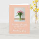 This card features a calm still-life of bright pink, cup-shaped flowers gathered in a clear glass vase, set on a white tabletop. Soft, diffused light gives the petals a gentle glow, like a quiet hug between close friends ❤️. Behind the arrangement, an off-white wall with a faint beige structural edge keeps the scene simple and airy, letting the blossoms take center stage. The lower half shifts into a smooth, soft peach field that feels warm and welcoming, like sharing a private note over tea 🌼. Centered across this peach area, the message appears in flowing white lettering: “Warmest thoughts for my Friend on Mother’s Day.” The text sits comfortably with plenty of open space around it, balancing the fuller floral arrangement above. The vase is transparent enough to show green stems crossing under the waterline, with the glass resting neatly on the bright white surface.