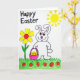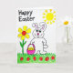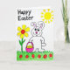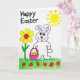 This design shows a white, long-eared bunny outlined in black with soft pink inside its ears and on its nose, standing on rolling green grass 🐰. It holds a bright pink basket filled with yellow egg shapes, angled slightly as if it’s being offered to someone just off to the side in a sweet, sharing gesture. To the left, a large flower with yellow petals and a deep red center rises on a green stem with a couple of leaves, leaning toward the bunny like a friendly companion 🌷. In the upper right, a simple golden sun with small triangular rays sits against the white background, warming the scene. Near the bottom edge of the grass, a few small red round shapes peek out as if tucked away for a little surprise. In the upper left, a short Easter greeting is written in thick, hand-drawn letters, using bright primary colors that stand out clearly on the white space. The bunny is placed in the lower middle area, with the flower balancing the left side and the sun balancing the right. The grass forms a wavy green band across the bottom, with the red round shapes dotted along its base.