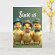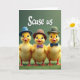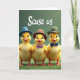 Designed with three fluffy, humanlike yellow birds lined up along the bottom of the card, set against a softly blurred emerald-green grassy background that feels like a quiet spring day 🌷. Their round bodies look soft and downy, and their small orange webbed feet rest on a lightly textured ground. The bird on the left wears a sky-blue hat tilted slightly, giving it a shy, friendly air as it leans subtly toward the others. In the middle, a bird in a warm brown hat and a lavender bow tie faces forward with an open beak, as if speaking for the group in a gentle, welcoming way. On the right, the third bird wears an olive-green hat and a dark blue bow tie, turning its bright-eyed gaze toward the center like it’s sharing an inside joke 🐰. Above their heads, the words “Scuse us” appear near the top in white cursive-style lettering, centered and easy to read. Soft, even lighting highlights the fluffy feather texture and the saturated colors of the hats and bow ties, with the trio forming a neat horizontal row across the lower edge.