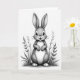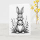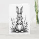 This card features a grayscale bunny 🐰 standing upright in the center of a wide white background, with its front paws lightly folded over its round belly as if pausing shyly to greet someone. Its large eyes have tiny white highlights, and the open smile and relaxed posture suggest a sweet, friendly connection, like it’s looking at a close friend with quiet affection. Soft shading gives the fur a gentle texture, while the long ears show darker tones in the inner folds for depth. Thin whiskers spread from the small snout, adding detail to the face without crowding it. Simple leafy sprigs and small floral shapes 🌷 in light and mid gray sit around the bunny as a loose frame, keeping the scene airy. There is no visible message text, leaving open space above and below the illustration for a short note in a small gray font. The background stays bright white, and the plants remain in pale gray tones around the centered bunny.