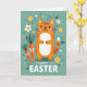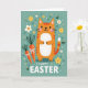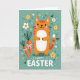 This card shows a friendly, stylized orange cat centered on the front, with soft stripes, a white belly, and a gentle smile that feels like it’s meant for someone close. Small dark eyes and pink cheeks give the cat a tender, affectionate look, as if it’s quietly sharing a sweet moment with the viewer. To the left sit two root vegetables in rich reddish tones with leafy green tops, each tied with a neat white bow like a thoughtful little gift. The background is a muted teal field sprinkled with simple yellow and white flowers, tiny white star marks, and curling green swirls that suggest a light spring breeze 🌷. Near the bottom, a rounded greeting appears in white lettering, centered and easy to spot against the teal. The flat, even lighting and smooth shapes keep everything calm and cozy, while the warm orange and cool teal balance each other nicely 🐰. Scattered five-petal blossoms and small white asterisks float around the cat’s head and along the sides of the card.