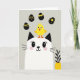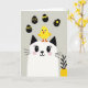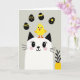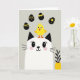Designed with a simple, modern look, the card centers on a large white cat’s head with black ears, wide gentle eyes, and soft pink cheeks that give it a friendly, affectionate expression. A small bright yellow chick sits on top with tiny wings slightly lifted and an open beak, as if chirping to its cat companion in a sweet moment of friendship 🐰. The background is a muted light gray that makes the white, black, and yellow colors stand out without feeling busy. Near the top, four dark egg-shaped forms float like decorations, each filled with sunny yellow patterns such as wavy lines, zigzags, and dotted details 🌷. Any text would sit above the characters in a dark color for easy reading, with small yellow accents that echo the chick and the egg patterns. In the lower right corner, a small yellow pot holds a sparse plant with dark leaves, adding a quiet, cozy balance to the scene. The cat’s rounded face and the chick’s perched stance create a gentle, companionable closeness, like two friends leaning into a shared spring day. The floating eggs show dark outlines with yellow stripes, zigzags, and dots against the soft gray background.