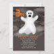 A children's Halloween party invitation featuring a "not too scary" friendly ghost.