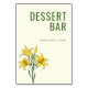 This wedding tabletop sign features a simple, elegant design with the phrase "DESSERT BAR" in bold, uppercase letters and an inviting message below. The layout is clean and minimalistic, showcasing a cluster of illustrated yellow lilies with delicate details against a soft cream background. The color palette includes deep green text and darker green stems, creating a harmonious contrast with the bright yellow flowers. The overall style is modern and understated, perfect for adding a touch of organic warmth to your event while encouraging guests to indulge in sweet treats.