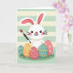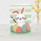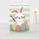 This design shows a friendly white bunny with long expressive ears, rosy cheeks, and wide dark eyes, smiling as it holds a paintbrush tipped in red 🐰. The bunny’s gentle tilt and bright gaze feel like it’s sharing a sweet moment with the viewer, as if inviting a close friend to join in. Along the bottom, several egg shapes sit on a small patch of green grass, arranged like a little collection set out with care. The eggs are colored in soft coral pink, warm orange, and calm teal, and each one has its own pattern of dots, wavy lines, and tiny stars. Behind everything, the background is filled with horizontal stripes that alternate between mint green and pale creamy yellow for a calm, springtime look 🌷. There’s no text shown on the front, leaving open space above the bunny and eggs where a short greeting could be placed in a simple contrasting color. The red paint on the brush stands out against the softer tones, and the striped backdrop stays evenly spaced from edge to edge.