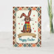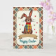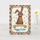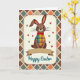 This card features an anthropomorphic rabbit centered inside a softly rounded rectangle that feels like an old-fashioned greeting frame. The rabbit is a warm brown with big, attentive eyes and a small smile, and its tall ears show a gentle pink interior. Around its neck sits a small red bow tie dotted with tiny white spots, layered over a larger checkered bib in teal, forest green, burnt orange, and earthy brown. Small hearts float around the rabbit—some deep red, others a muted taupe—like quiet hints of affection and friendship 🐰. Beneath the rabbit, a tan banner stretches across the lower area with a short Easter message written in teal lettering, placed neatly along the center of the banner 🌷. The background is a creamy, lightly textured field that keeps the focus on the character and the floating hearts. An outer frame of repeating diamond shapes in deep brown, soft orange, and teal surrounds the scene on an aged-cream border.