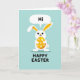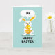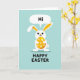 This card features a light blue background with a white bunny centered on the front, drawn with smooth outlines and a small, friendly smile 🐰. The bunny’s big round eyes and slightly tilted head give it a tender, companionable look, as if it’s greeting someone it cares about. Its long ears have warm orange inner details that echo the sunny object it holds close. Cradled in its paws is a large golden-yellow egg shape decorated with fine white patterns, including tiny egg motifs and zig-zag lines. Above the bunny, a white speech bubble contains a short greeting set in thick black lettering, placed like a cheerful thought floating overhead 🌷. Beneath the character, a second message appears in simple all-caps lettering, aligned neatly near the bottom in a dark contrasting color. Soft shadows sit under the bunny and the egg, and the orange ear interiors stand out against the calm blue field.