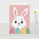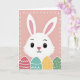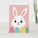 This card features a friendly white rabbit centered on a soft blush-pink background, its wide dark eyes and slight upward smile giving it a gentle, companionable look 🐰. The tall ears stand upright with light pink inner shading, drawn with simple lines that suggest soft fur. A small rose-tinted nose sits above the curved mouth, adding to the sweet, inviting expression. Along the bottom edge runs a neat row of four oval egg shapes, arranged side by side like decorations set out for a shared spring morning 🌷. Each egg has its own pattern and color—coral zigzags, teal waves, yellow speckles, and deep green dots—outlined in white for crisp contrast. Around the entire design, an even border of small white dots frames the scene, keeping the focus on the rabbit and the eggs. There is no headline text, leaving open space above and around the rabbit’s face, while the patterned eggs anchor the lower portion with their repeating shapes and colors. The rabbit’s pink-lined ears rise above its head, and the four patterned eggs stretch across the bottom in a straight line.