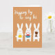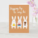 This card features a soft orange-brown background with three long-eared, rabbit-like figures standing side by side along the lower area 🐰. Their bodies are simple white shapes with small black dot eyes and tiny pink noses, and they lean slightly toward one another as if sharing a friendly moment. Above them, the phrase “Hopping by to say hi” sits near the top in a loose, flowing style, written in dark lettering that stands out clearly. The left figure holds a yellow basket decorated with a zigzag pattern, angled outward like it’s being shown to a friend. Next to it, the middle figure carries a red-and-blue patterned basket, held close as if bringing a small treat to share 🌷. On the right, the third figure cradles a small brown stuffed animal, tucked in gently against its front like a comforting companion. The trio’s tall ears point upward in slightly different directions, creating a simple rhythm across the bottom of the design.