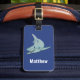 A friendly shark swims on the front with your child's name. Name and address are on the back.