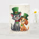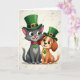 Designed with a sweet St. Patrick’s Day scene, the front shows a sleek grey cat and a fawn-brown dog standing close together, their bodies touching as if they’ve leaned in for a cozy photo 💚. Both wear green top hats with gold buckles, and the cat’s wide green eyes and small smile angle toward the dog with a tender, familiar look. A red collar circles the cat’s neck, and a little shamrock charm hangs down like a lucky keepsake ☘️. The dog faces forward with bright green eyes and a tiny bit of tongue showing, its golden collar catching the light beside another shamrock charm. Behind them is a pale, lightly marbled background that stays soft and quiet so the two friends remain the focus. The illustration uses gentle shading and crisp outlines to highlight their fur, hats, and shiny buckles. Near the top, St. Patrick’s Day text sits in green lettering with small gold accents against the light marble backdrop, inviting you to share St. Patrick’s Day sentiments.