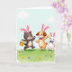 This card shows three friendly animal companions wearing pink-lined bunny ears as they stroll left to right across a sunlit green meadow 🐰. A dark, cat-like friend leads the way with a small golden basket, glancing back with an inviting smile that pulls the group together. In the middle, a warm brown, dog-like pal with a purple bow tie cradles a white egg and a tiny yellow chick, held close like a gentle gift for friends. Beside them, a bright white rabbit-like character in a blue bow tie leans forward with an eager posture, as if keeping pace with someone they care about 🐇. Above the scene, a light pastel blue sky with soft clouds keeps the background calm and airy. The greeting text sits near the top in a simple, rounded style, colored in a soft spring shade that stands out against the sky without overpowering the illustration 🌷. Purple and yellow wildflowers dot the grass in small clusters, with the trio framed by smooth, watercolor-like shading and diffused light.
