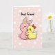 This card shows a soft, digital illustration of two cute, animal-like friends cuddling close, with a gentle, romantic kind of closeness in the way their bodies lean into each other 🐰. A larger pink long-eared creature stands on the left, eyes closed with rosy cheeks, holding the smaller companion as if not wanting to let go. A tiny white flower sits above its ear, adding a sweet detail that matches the tender mood. Nestled in its arms is a small yellow, bird-like friend with an orange beak, round dark eyes, and a red bow that feels like a little gift of affection 🐇. The background is pale pink, and it’s sprinkled with small white circles that look like soft confetti drifting through the air. Near the top, friendship words are written in a loose, hand-drawn style, set in a darker pink tone so they stand out against the light backdrop. The white circles are spaced across the whole scene, with a few clustered near the characters’ heads and shoulders.