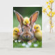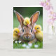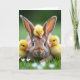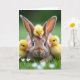 This card features a close-up scene in a sunlit green meadow where a tawny brown rabbit gazes forward with large, dark, glossy eyes while fine whiskers fan out along its muzzle 🐰. A tiny yellow chick perches right on top of the rabbit’s head, its small pink beak and curious eyes giving the moment a gentle, affectionate spark. Two more fluffy yellow chicks cuddle close at the rabbit’s side, their bodies forming a cozy cluster that reads like quiet friendship in nature 🐇. The background fades into a soft green blur, keeping attention on the detailed textures of fur and down. Small white wildflowers appear as light specks in the foreground, adding a springtime touch without stealing focus 🌷. The greeting text sits near the top in a soft white tone, with a smaller line of text placed near the bottom in a matching color for balance. A warm, diffused light highlights the rabbit’s ear edges and the chicks’ down, with the brightest yellow perched above the rabbit’s forehead against the green backdrop.
