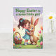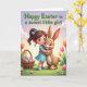 This design shows a cheerful young girl hugging a friendly upright rabbit 🐰, their faces close with a tender, trusting look and matching rosy cheeks. The girl has big brown eyes, a teal-blue dress, and a neat bow in her hair, while the rabbit has soft brown fur, long alert ears, and a gentle smile. Behind them, a spring sky fades from lavender at the top to warm yellow near the horizon, like early morning light. In the green grass at the front sits a woven basket filled with brightly decorated eggs, with a few more eggs scattered nearby among tiny blossoms 🌷. Tall tulips in orange, pink, and yellow rise in the background, framing the pair like a garden stage. Across the top, a seasonal greeting is set in large green lettering, centered and easy to read against the lighter sky. Small flowers and speckled egg patterns dot the ground around the basket, adding little pops of color near their feet.