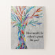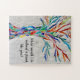 This decorative jigsaw puzzle features a mosaic tree in rainbow colors and the words,