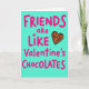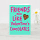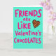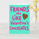 This greeting card features a teal background with hot pink lettering that really stands out. The main text reads “FRIENDS are LIKE Valentine’s CHOCOLATES,” with “FRIENDS” and “CHOCOLATES” in big, rounded block letters and the smaller words tucked neatly between them. The message sits centered on the card and feels easy to read at a glance. A fun detail is that the “O” in “CHOCOLATES” is replaced by a heart-shaped cutout with a dark outline. Inside that heart shape, you see a close-up photo of chocolate chips, adding a real, tasty texture against the flat graphic design 🍫. The mix of bright teal, hot pink, and the chocolate browns keeps the look warm and friendly ❤️💌❤️