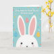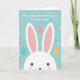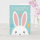 This card features a long-eared rabbit peeking up from the bottom edge, as if leaning in to greet a close friend 🐰. Its round white face has tiny black dot eyes and soft pink blush on the cheeks, giving it a shy, friendly look. Two tall white ears rise into a pastel blue background, with pale pink inside the ears adding a gentle touch. Between the ears near the top, a message in a rounded, friendly typeface reads “Giving thanks for friends like you this Easter season!” in a dark ink that stands out clearly. Around the text, small confetti-like dots in orange, yellow, pink, white, and light blue scatter across the sky, like a shared celebration in midair 🌷. Several egg-shaped ornaments float nearby, each decorated with neat patterns of small white dots that echo the confetti. The overall layout keeps the rabbit low and centered while the message sits above, framed by the ears and surrounded by pastel dots and patterned eggs. The background is a smooth pastel blue field sprinkled with multicolored dots and dotted egg shapes above the rabbit’s ears.