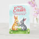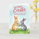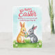 This design shows two cute bunny figures, one soft golden-brown and the other gentle gray, standing close together on a green lawn sprinkled with tiny white flowers 🌷. Their heads tilt toward each other with small smiles and lightly rosy cheeks, suggesting a sweet bond as they share the moment. Between them, they hold a large oval egg with wide pastel stripes in pink, blue, yellow, and green, their paws meeting near the center as if working together 🐰. Near the top, a seasonal greeting appears in coral lettering, centered and easy to spot against the pale sky. A second line of text sits lower on the card in a simple, refined font, also in coral, balancing the layout without crowding the artwork. Behind them, the background fades into a light spring sky with soft washes of pale blue and white, giving the scene an airy, watercolor look. The grass is painted with gentle texture and thin blades, while the bunnies have fluffy edges and subtle shading around their faces and ears. Small dark eyes catch tiny highlights, and the striped egg shows smooth bands of color with a lightly shaded curve for depth.